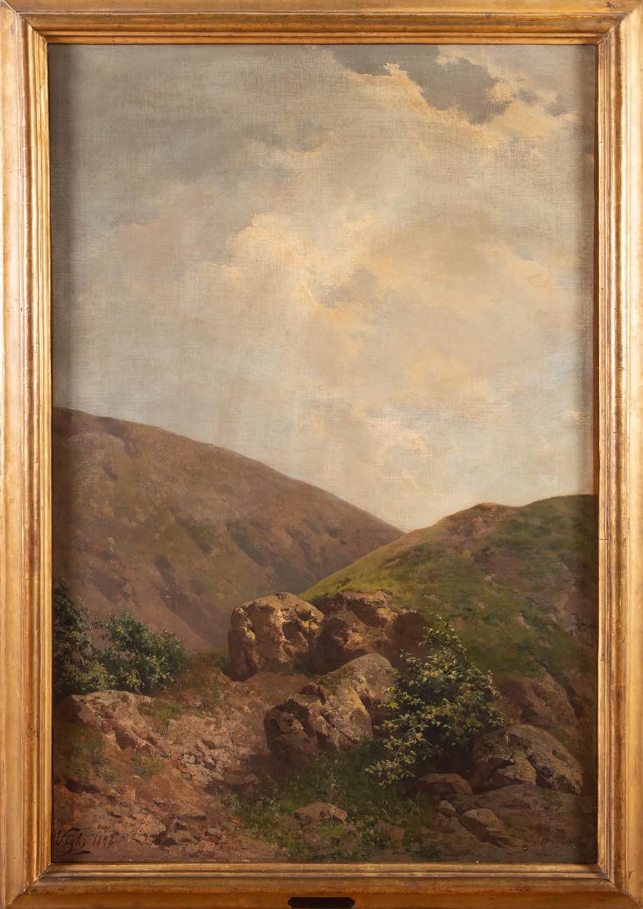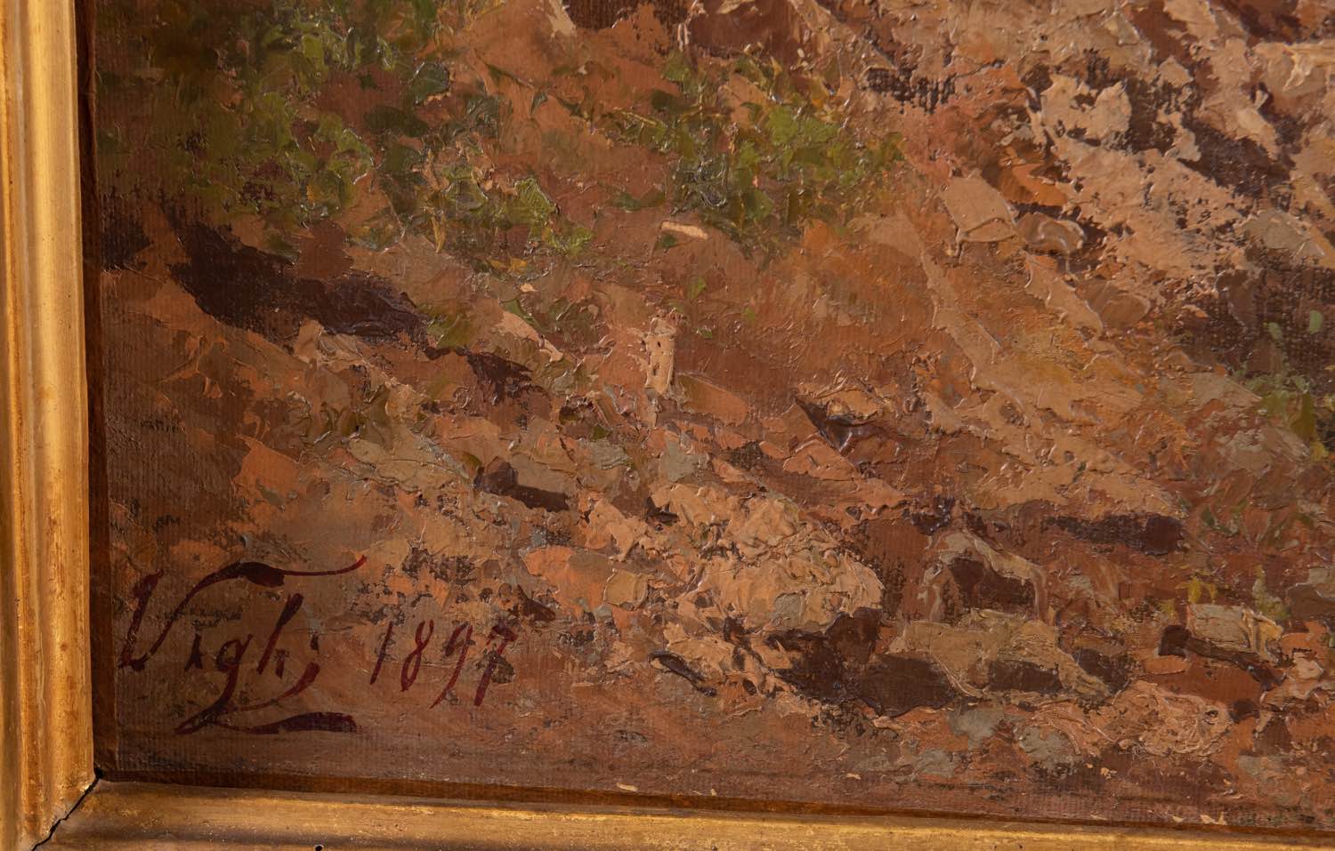 Coriolano Vighi (Firenze 1852 - Bologna 1905), “Paesaggio”, 1897 Olio su tela, firmato e datato in basso a sinistra Vighi 1897, H cm 136x91 Al retro reca etichetta Mostra di Pittori Emiliani dell’Ottocento, Bologna - Palazzo Bolognini-Amorini, 25 Settembre - 15 Novembre 1955 - fuori catalogo. Opere provenienti dalla collezione dell’antiquario bolognese Accursio Accorsi.