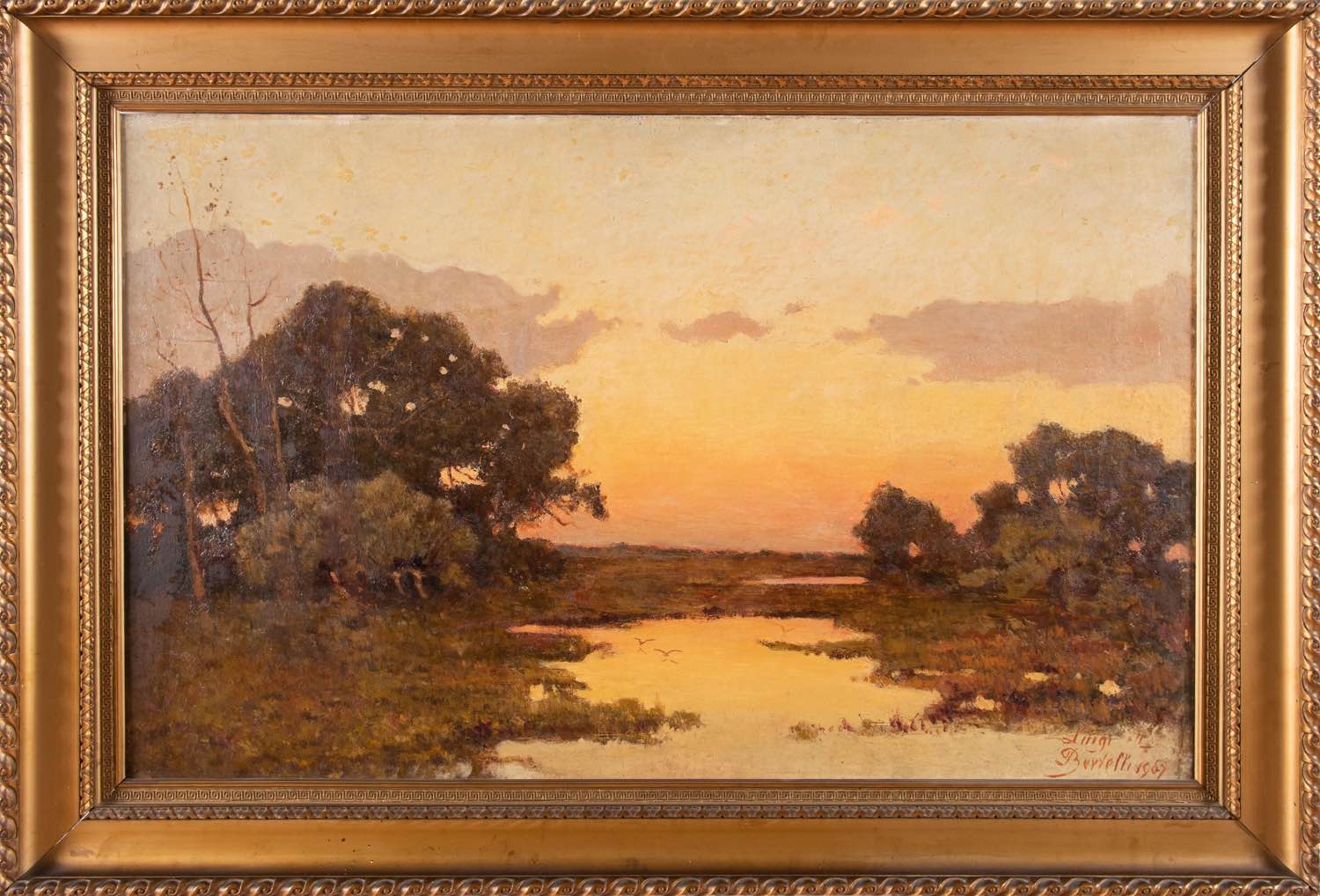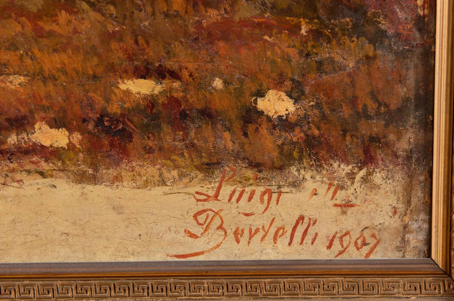 Luigi Bertelli (San Lazzaro di Savena 1833 - Bologna 1916), “Tramonto in pineta”, 1907. Olio su tela, firmato e datato in basso a destra Luigi Bertelli 1907, H cm 74x118 Al retro reca etichetta Mostra Antologica ‘Luigi Bertelli - Palazzo d’Accursio, Bologna, 3 Dicembre 2011 - 16 Gennaio 2012 - Associazione Bologna per le Arti.Bibliografia di riferimento: Catalogo della Mostra Antologica ‘Luigi Bertelli - Palazzo d’Accursio, Bologna, 3 Dicembre 2011 - 16 Gennaio 2012 -Associazione Bologna per le Arti - Umberto Allemandi & C, n. 95, pubblicato a piena pagina.Opere provenienti dalla collezione dell’antiquario bolognese Accursio Accorsi