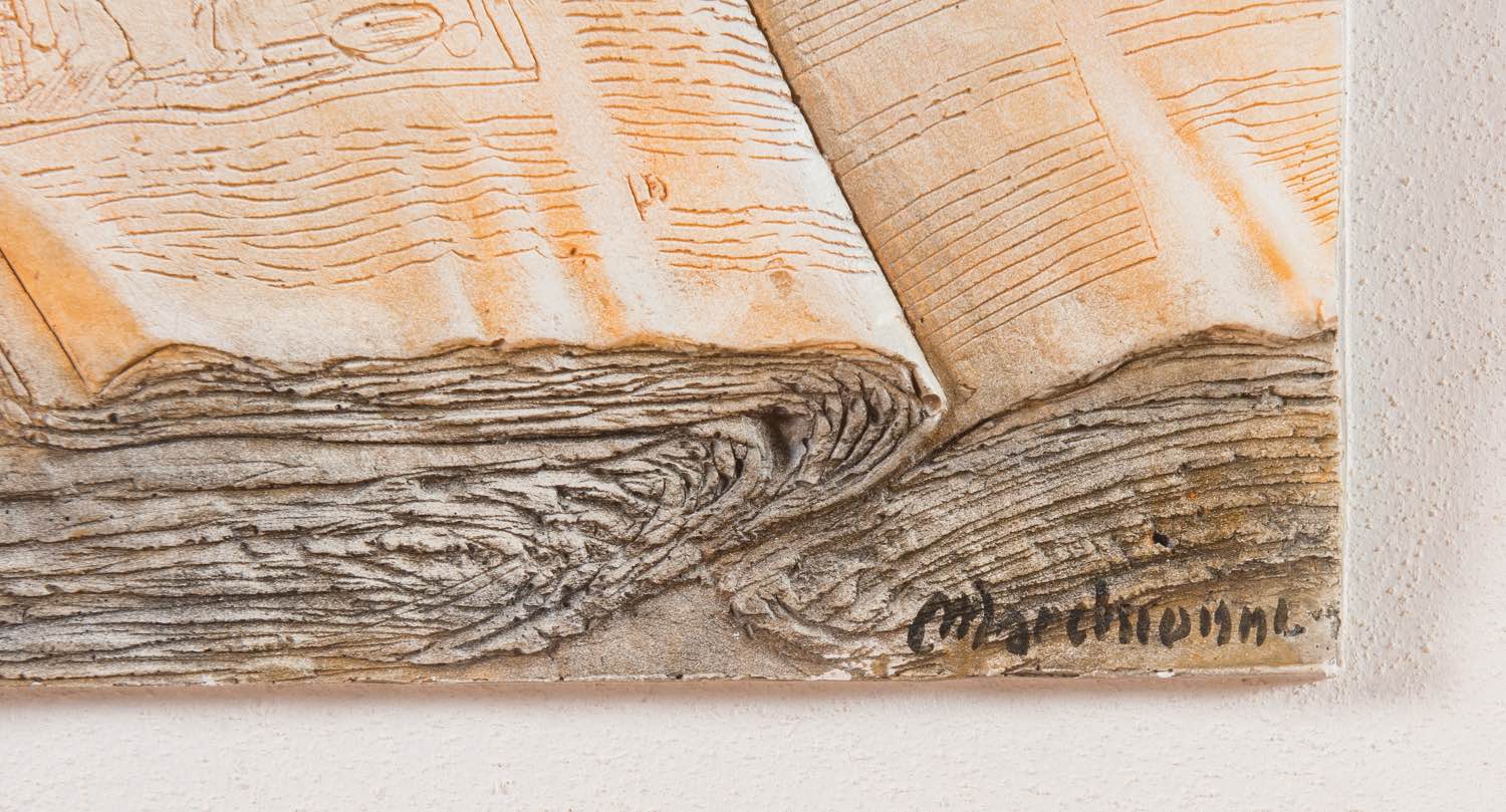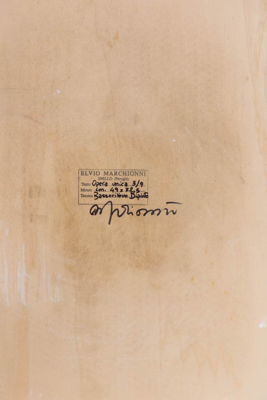 Elvio Marchionni (Spello 1944), “I colori dell’anima”. Bassorilievo dipinto, firma in basso a destra Marchionni, numero di tiratura in basso al centro 3/9, H cm 72.5x49 Al retro timbro dell’artista e firma. Opera accompagnata da Certificato di Autenticità dell’artista e Certificato Fondazione Archivio Sotrico, 2008.