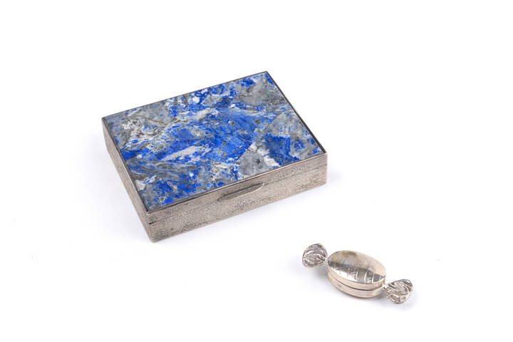 -Scatola in argento con coperchio recante geometria con lastre di lapislazzuli; interno dorato. Cm 8,5x10. Peso gr