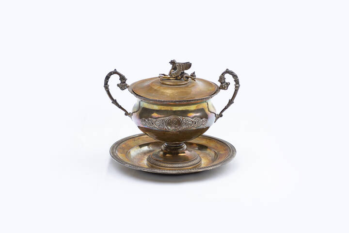 Coperchio con animale fantastico alato, corpo bombato impreziosito da decori a palmette e teste virili, manici a volute vegetali terminanti con cornucopie. Punzoni, città di Torino, punzone di Carlo Baldino