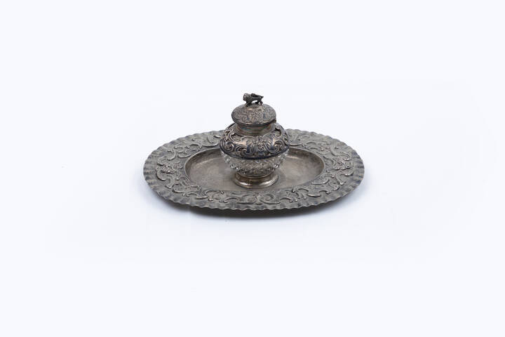 punzoni non identificati; boccetta in vetro, coperchio con presa a forma di leone e piattino in argento sbalzato ed inciso