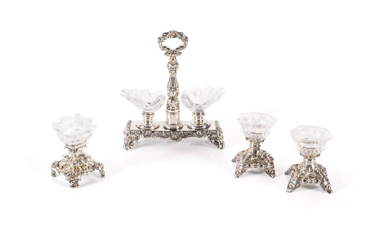- una saliera a due coppe, vetri a forma di conchiglia, base e presa sbalzate a motivi vegetali. Punzoni francesi. Peso lordo gr 262,1.