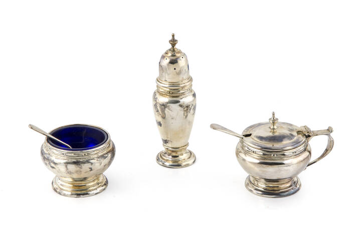 Composto da una pepiera e due saliere di cui una con coperchio, vetri interni di colore blu
