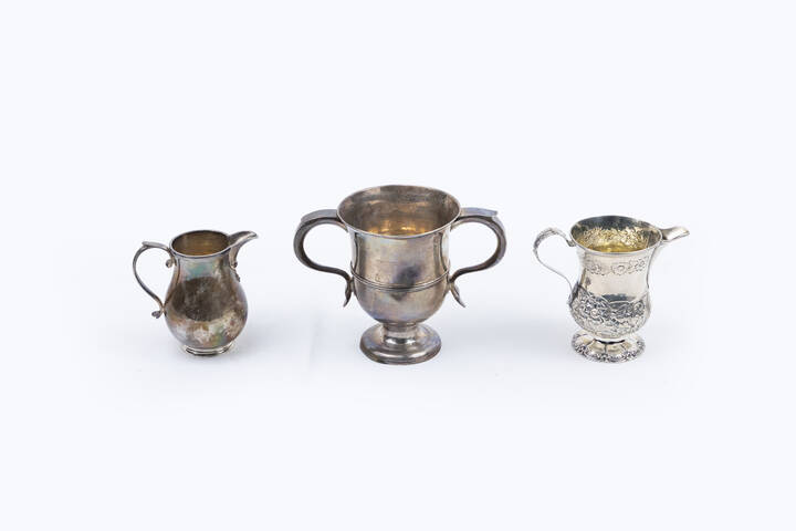 - Boccale sagomato e trasformato in lattiera, epoca Giorgio III, Londra 1765, sbalzato e cesellato, argentiere John Pine. Peso gr. 212.0