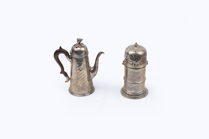 -Spargizucchero in argento. Inghilterra, epoca Giorgio I , città di Londra 1716, argentiere prob. George Lambe. (con dedica sotto la base a lady Mongomery Moore). Peso gr. 598.0