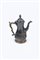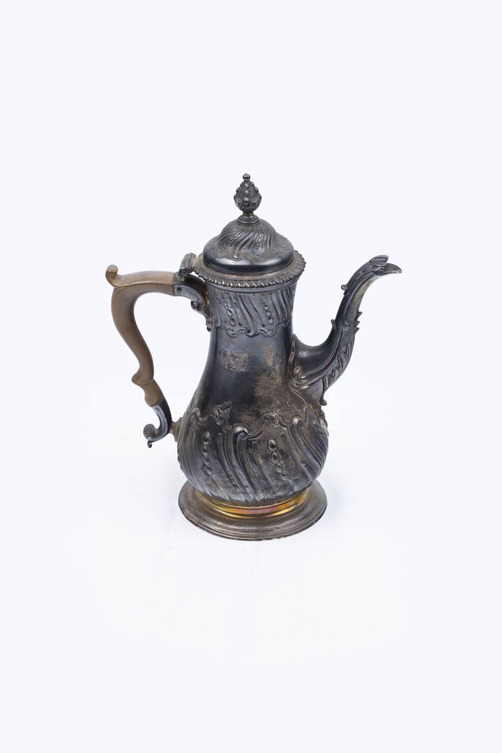 Grande caffettiera con corpo bombato sbalzato a motivi di volute e baccelli. Manico in legno a voluta. Presa a forma di pigna. Poggiante su base circolare