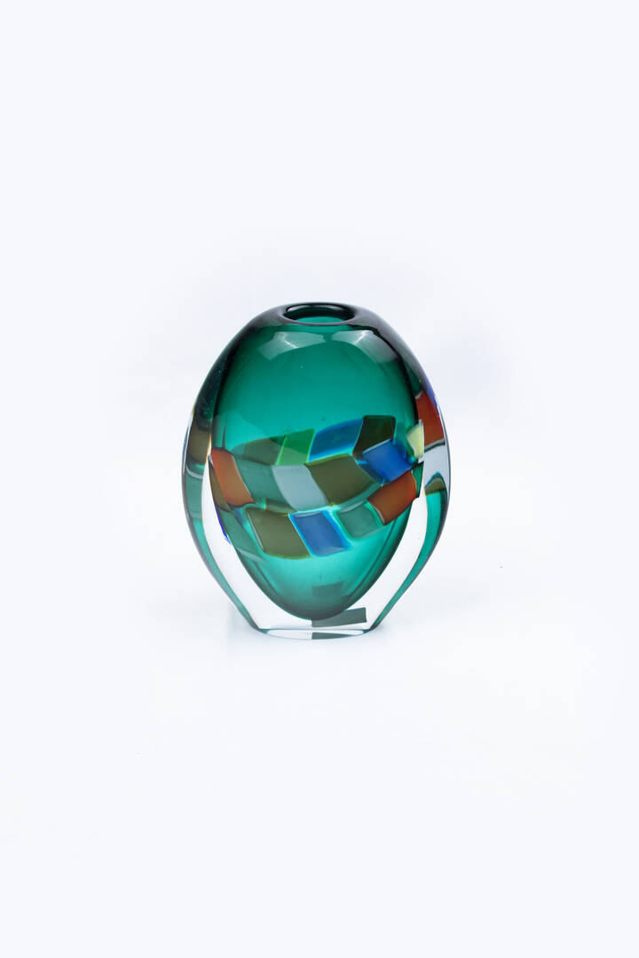 Vaso soliflore in vetro di Murano nei toni del verde con decori a motivo "pezzato"