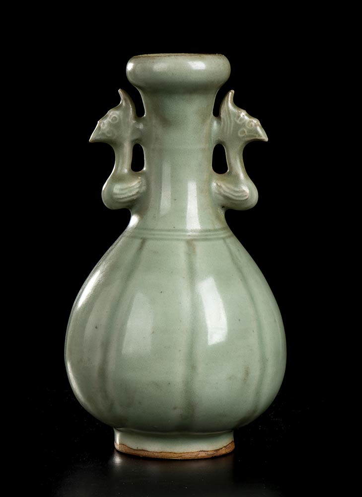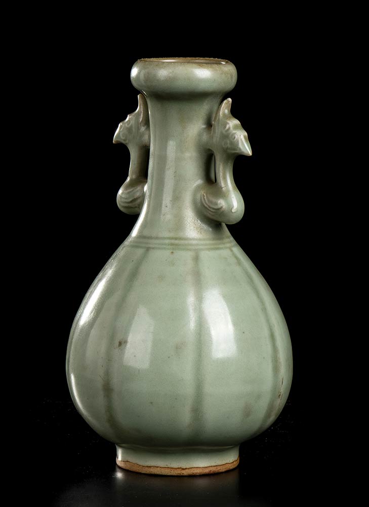 A sezione circolare, ha il corpo ovoidale percorso da solchi verticali, ai lati del lungo collo cilindrico anse a forma di fenice, la bocca con profilo bombato, l'intera superficie esterna ricoperta di invetriatura verde céladon.