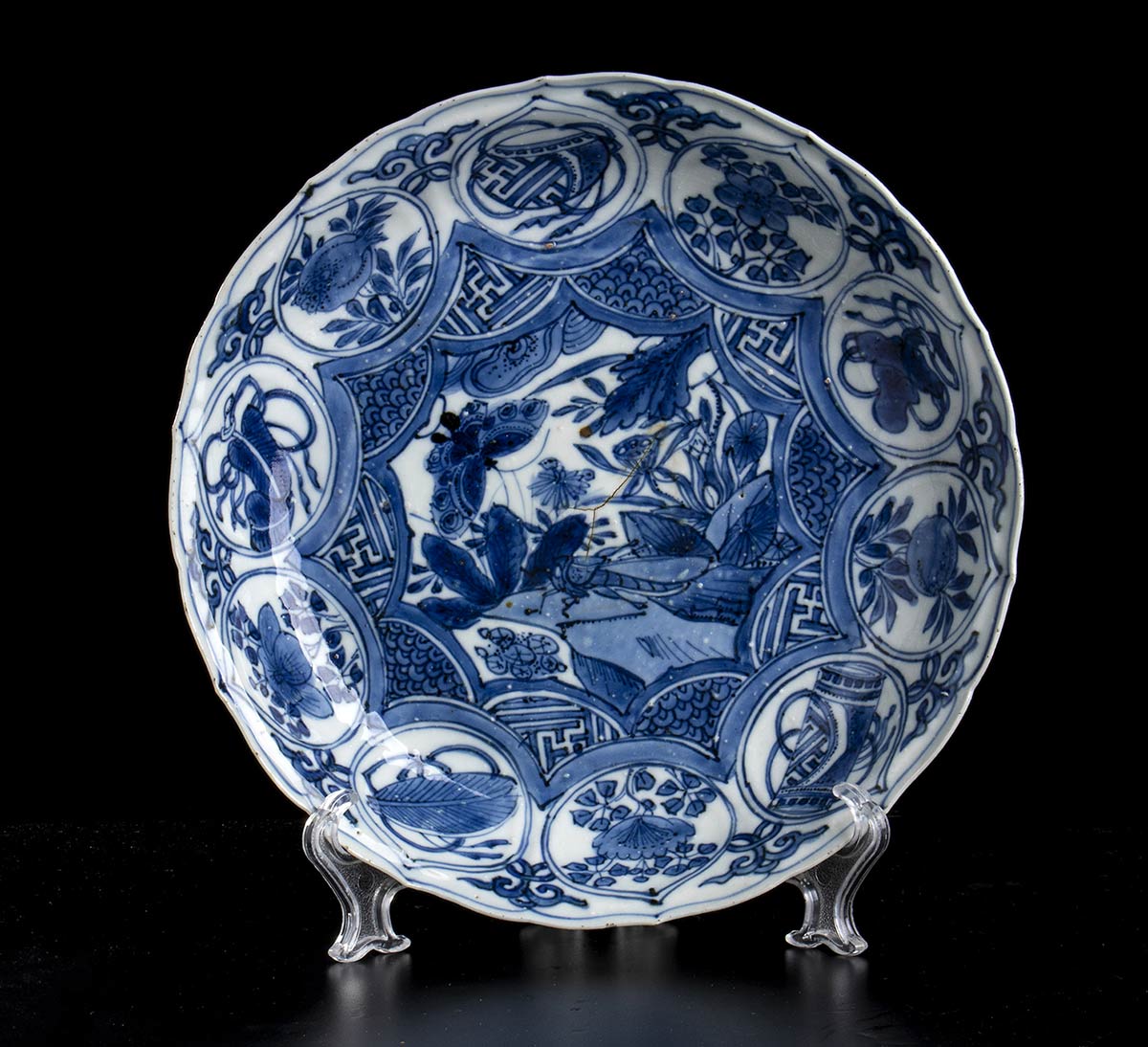 PIATTO IN PORCELLANA 'BIANCO E BLU' DI TIPO 'KRAAK'<br>Cina, dinastia Ming, inizio del XVII secolo