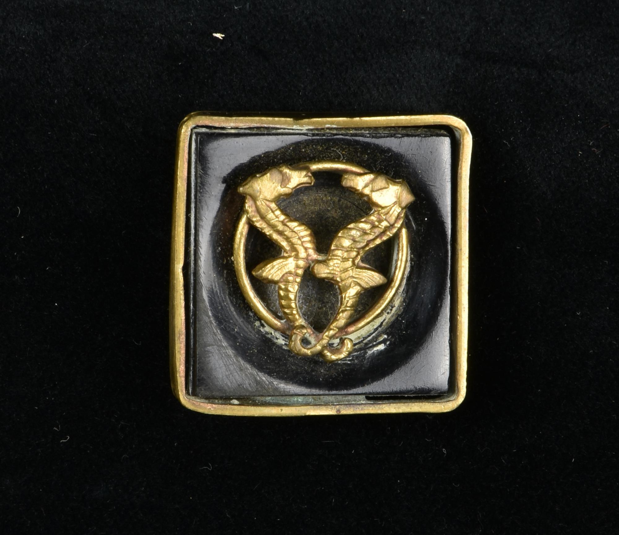 SPILLA IN METALLO DORATO E ONICE con simbolo raffigurante due cavallucci...
