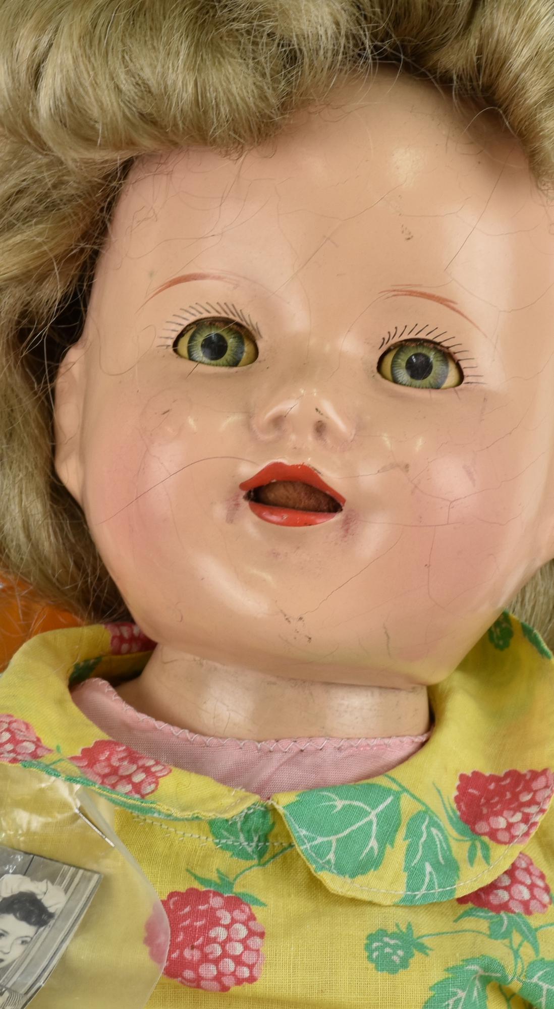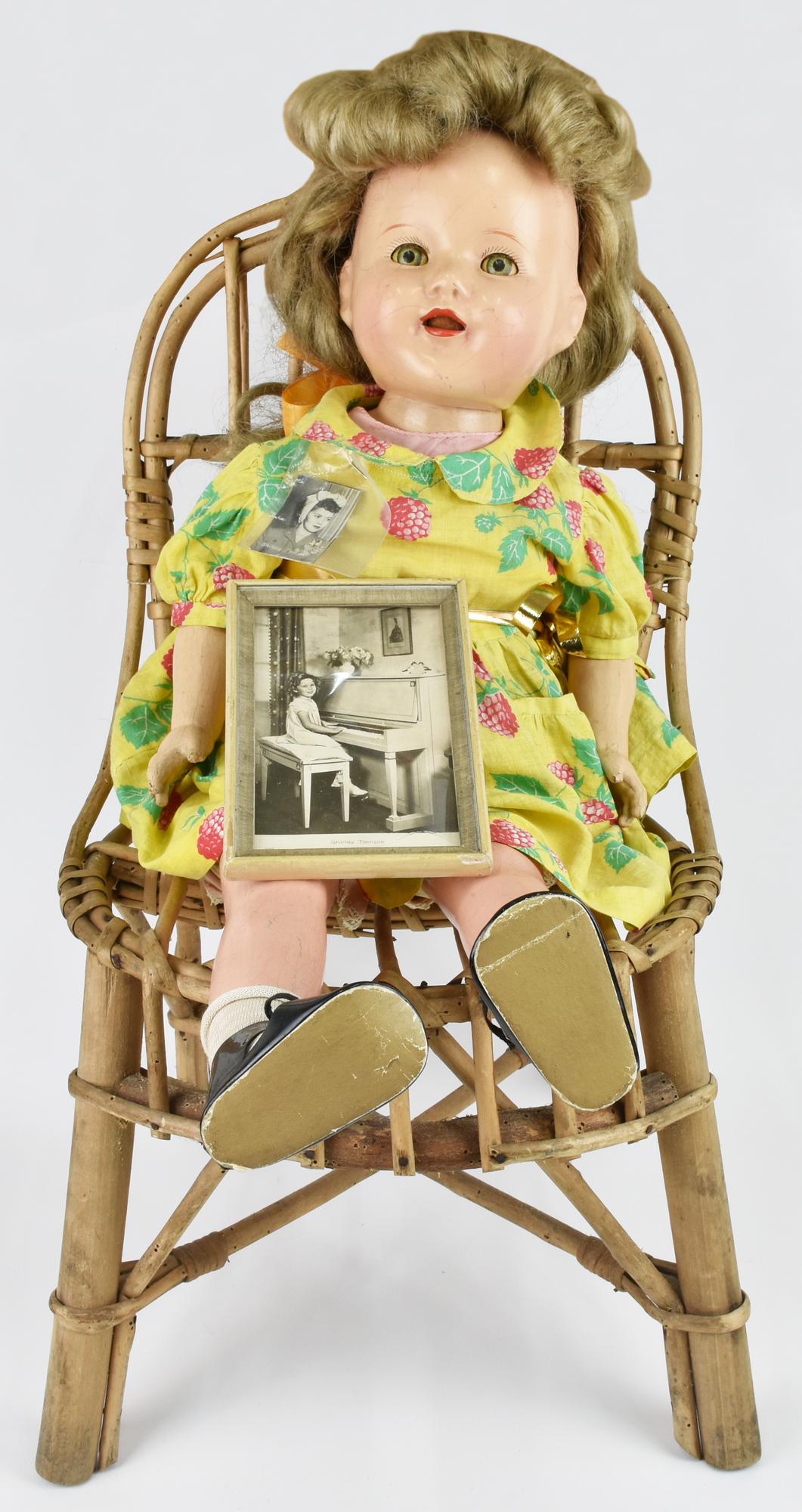 in composizione completa di abiti e parrucca corredata da fotografia raffigurante la celebre bambina prodigio. Marca Ideal Doll