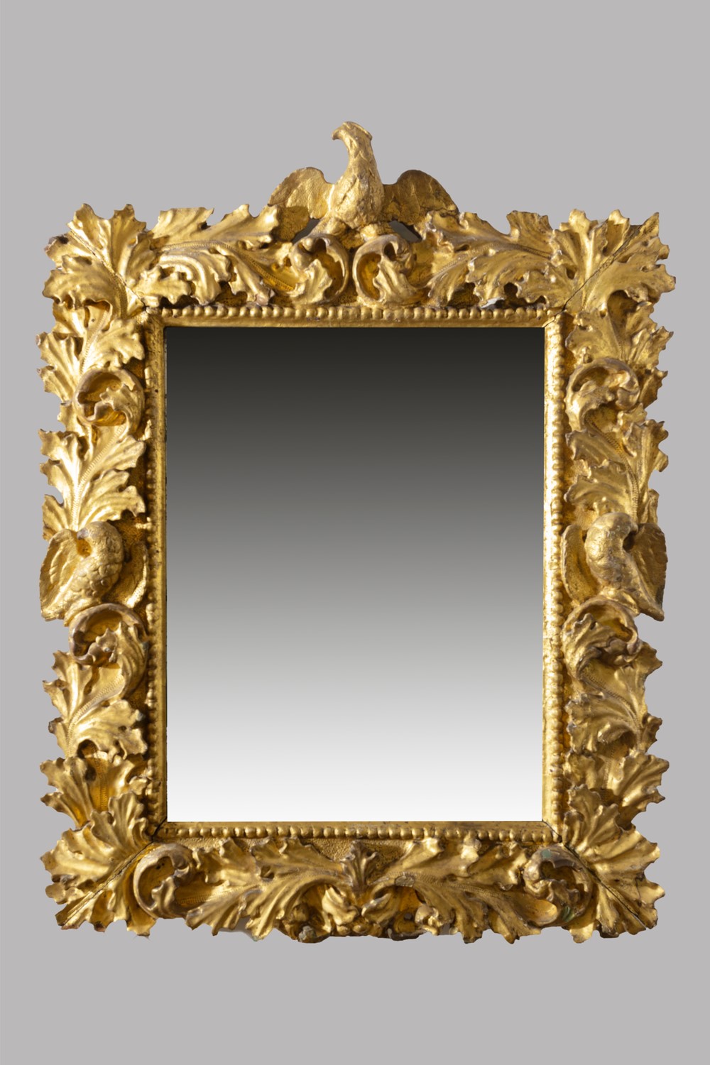 Specchiera riccamente intagliata e dorata con fogliami e volatili, secoli XVII-XVIII