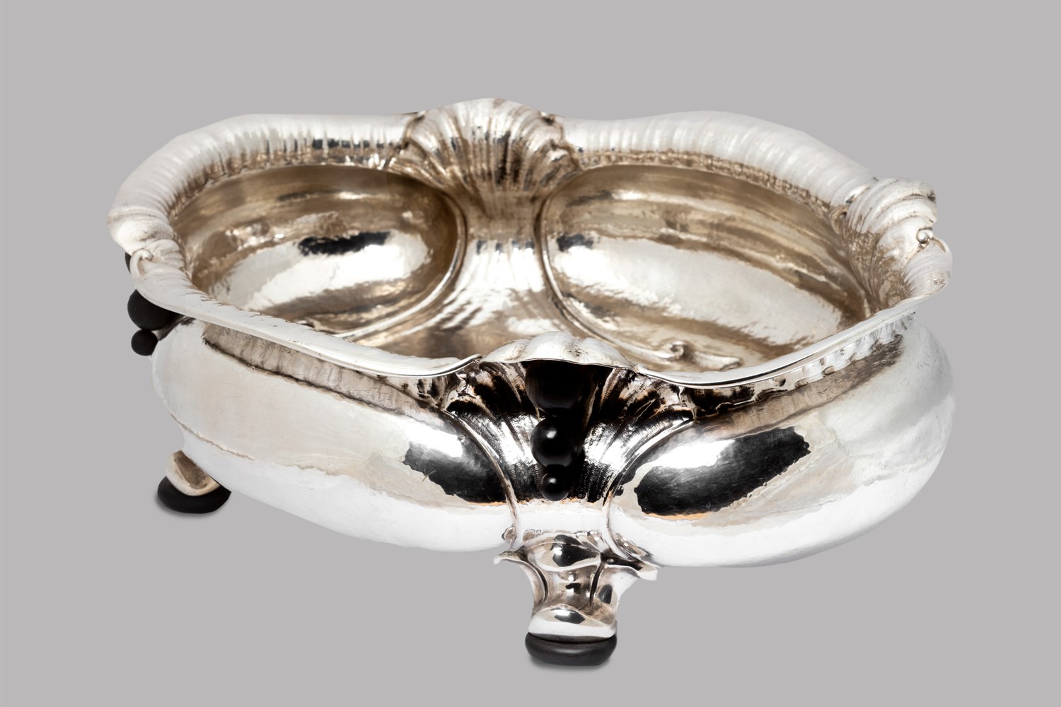 Grande centrotavola in argento, con sfere e piedini in legno, Genazzi, Milano