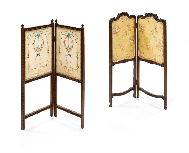 Lotto composto da due paraventi in noce, a due elementi: il primo con interno in stoffa; il secondo con interno in carta dipinta ad acquerello con motivi floreali