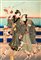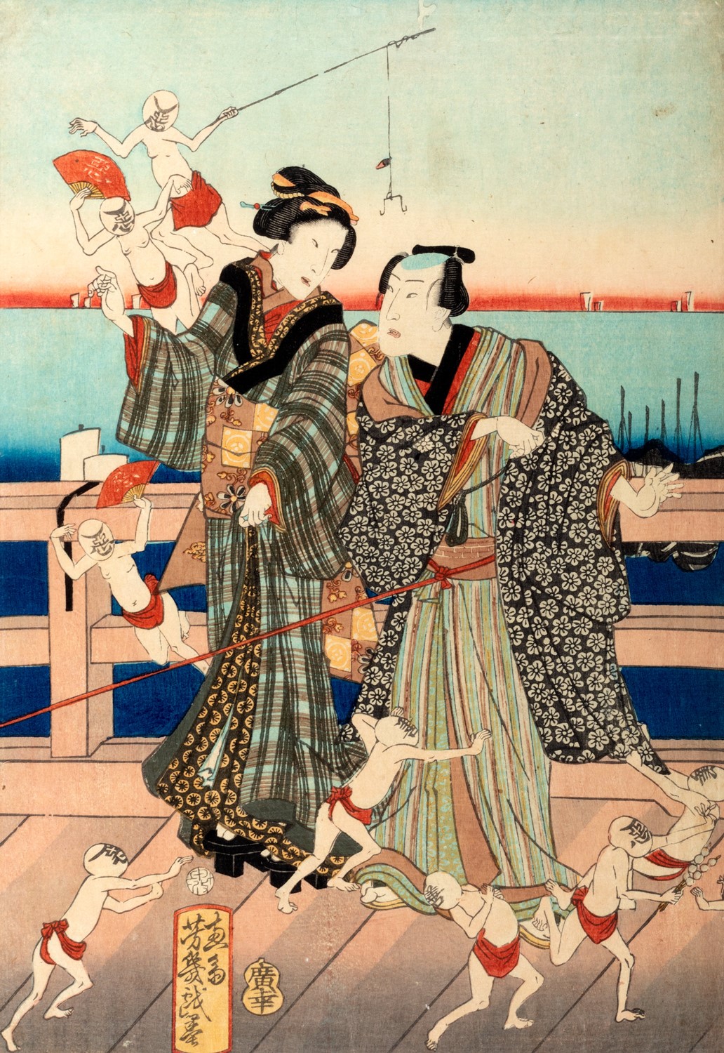 Yoshiiku - Stampa raffigurante figure su un pontile, Giappone periodo Meiji