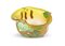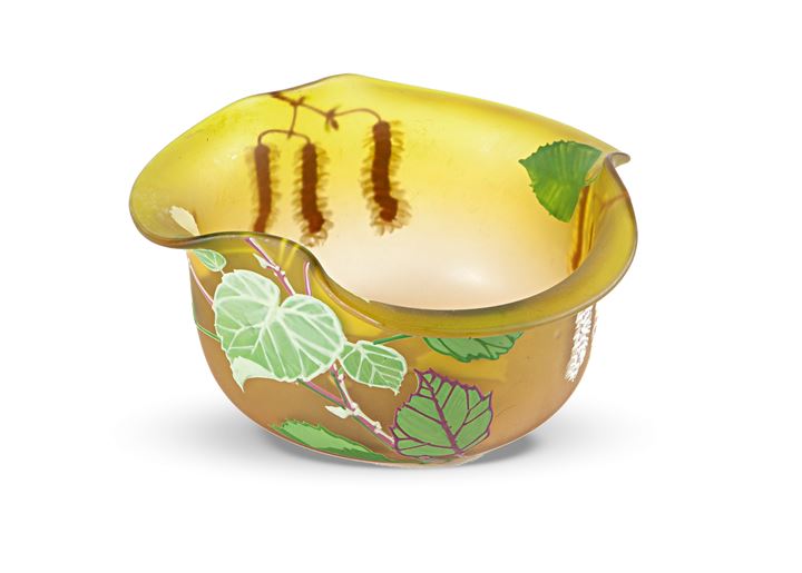 Coppa trilobata in vetro, decoro a foglie di smalti policromi su fondo giallo-rosato. Non firmata, epoca