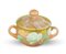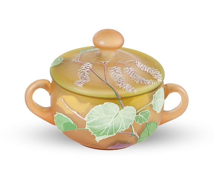 Zuccheriera in vetro con anse applicate a caldo, decoro a foglie di smalti policromi su fondo rosato.