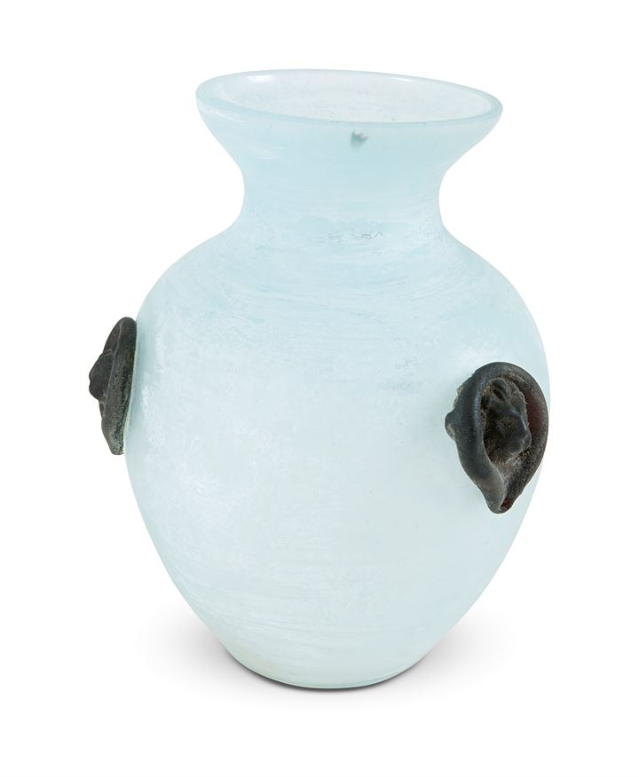 VASO IN VETRO DI MURANO Vaso ovoidale in vetro nei toni del celeste screziato...