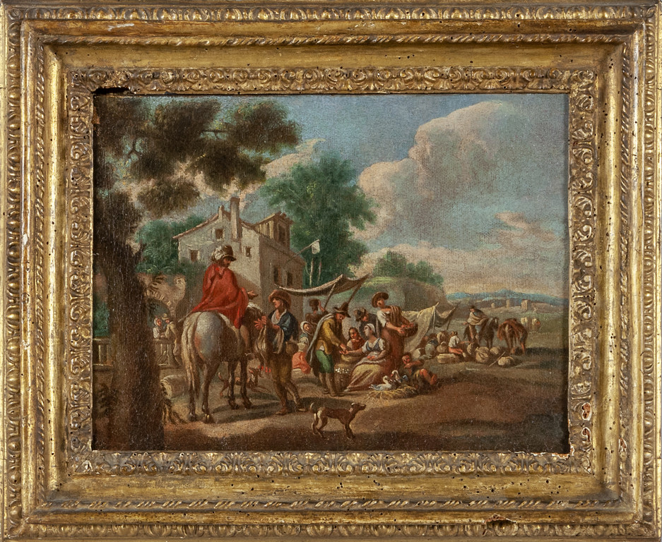 Scuola piemontese sec.XVIII 'Scena di mercato' olio cornice coeva in legno intagliato e dorato a più ordini