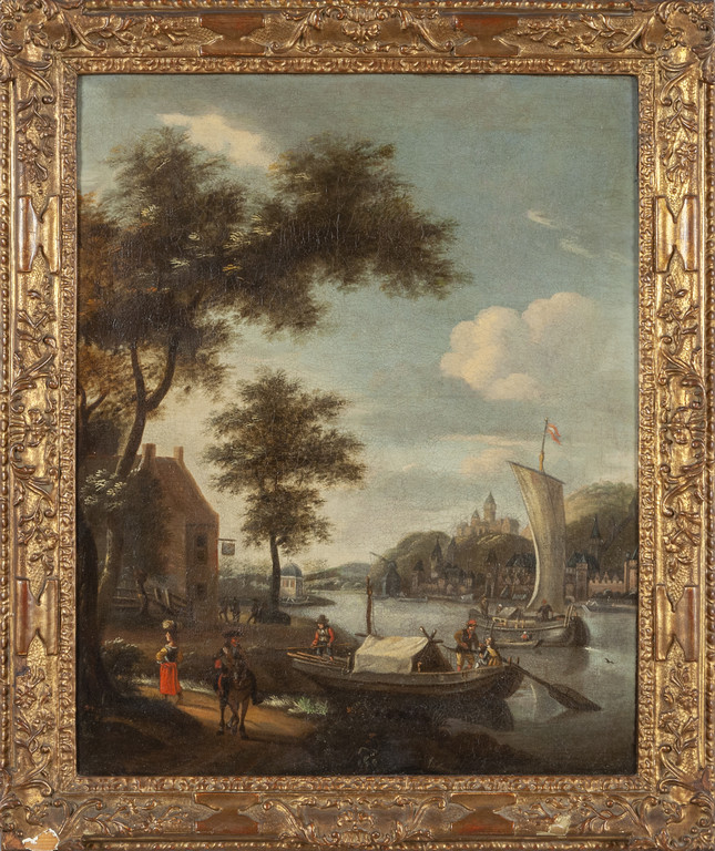 Scuola fiamminga sec.XVIII 'Il traghetto' olio cornice in legno dorato