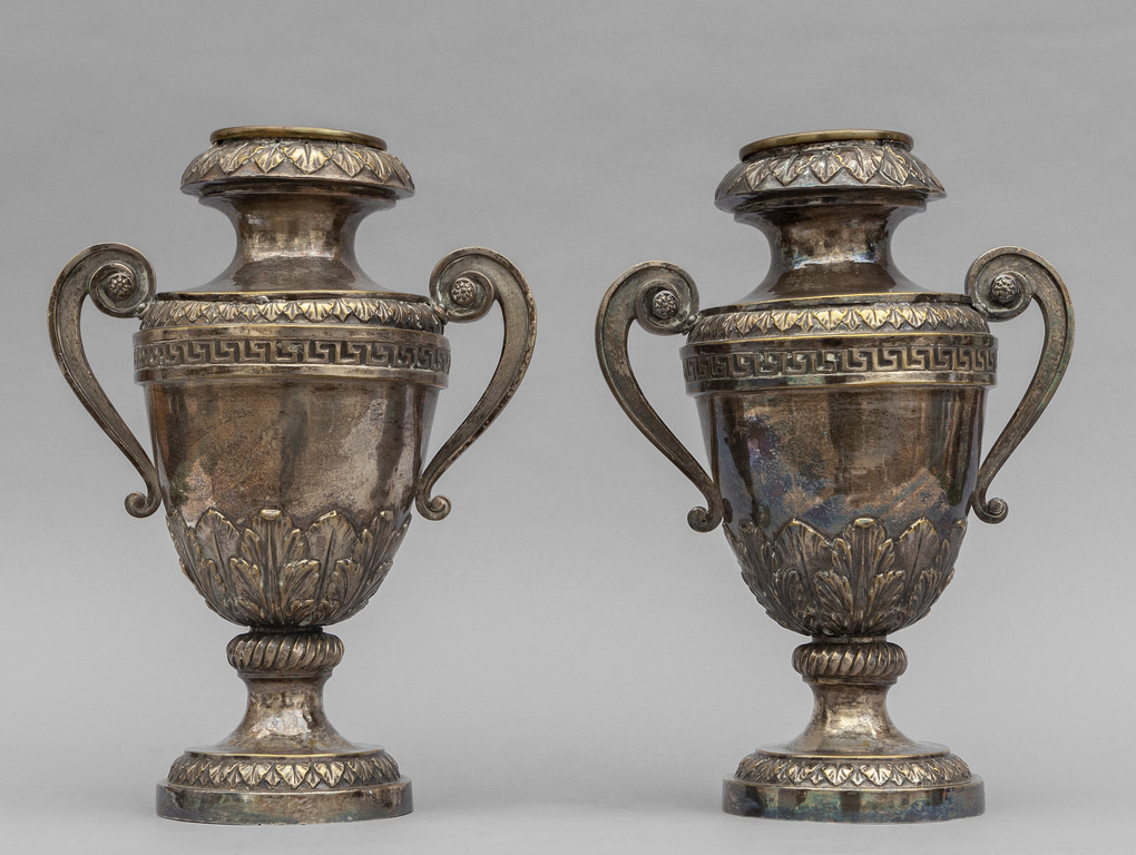 Coppia di vasi Luigi XVI con manici in metallo argentato e finemente sbalzato Genova fine sec.XVIII