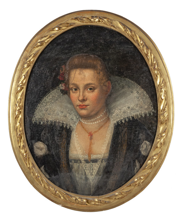 Scuola lombarda sec.XVII 'Ritratto di dama con collana di perle' olio di forma ovale
