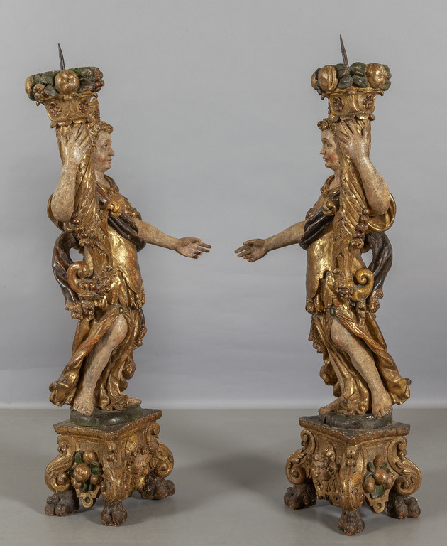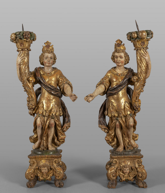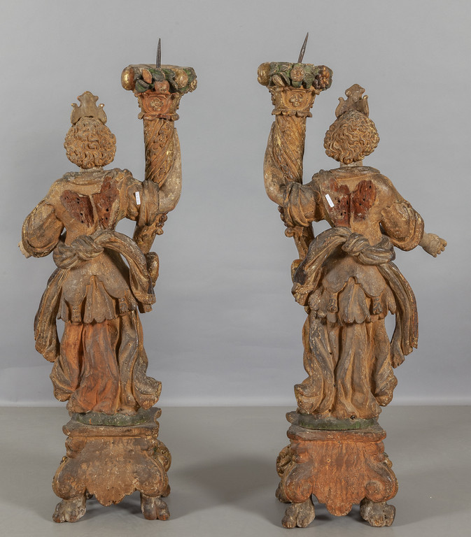 Coppia di grandi angeli portacero in legno finemente intagliato dorato e laccato Toscana inizi sec.XVII