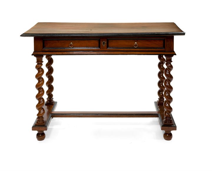 Tavolo-scrittoio in noce, Lombardia inizio XVIII secolo, un cassetto nella fascia; bordi ebanizzati; poggiante su quattro gambe a tortiglione raccordate da traversa. Piedi a cipolla