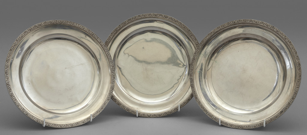 Tre piatti in argento bordi sbalzati con greca Roma fine sec.XVIII