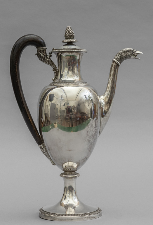Caffettiera in argento finemente sbalzato beccuccio terminante con testa d'aquila presa con terminale a forma di pigna Milano fine sec.XVIII/inizi sec.XIX