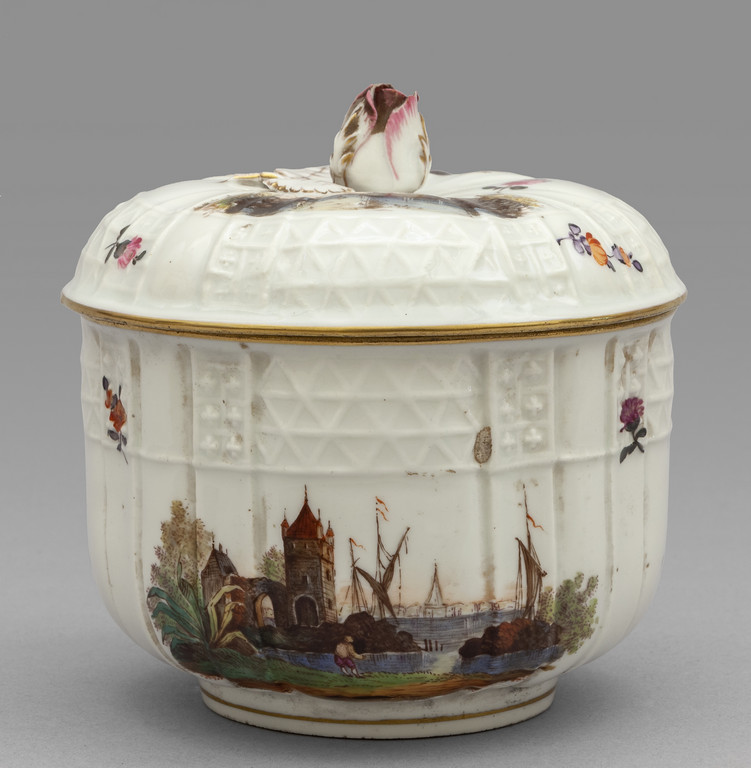 Scatola in porcellana decorata in policromia a paesaggi su fondo bianco Germania sec.XVIII