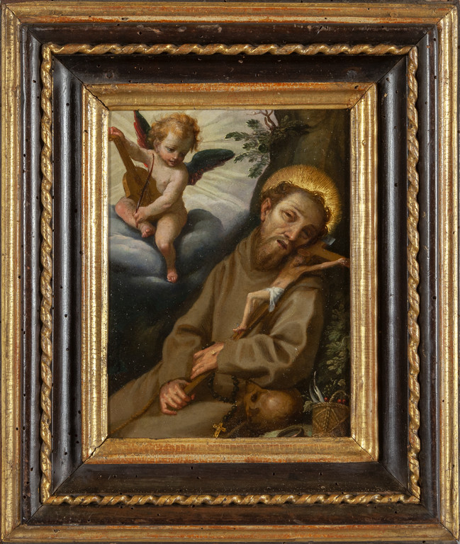 Scuola toscana sec.XVII 'San Francesco con angioletto' olio su rame cornice antica