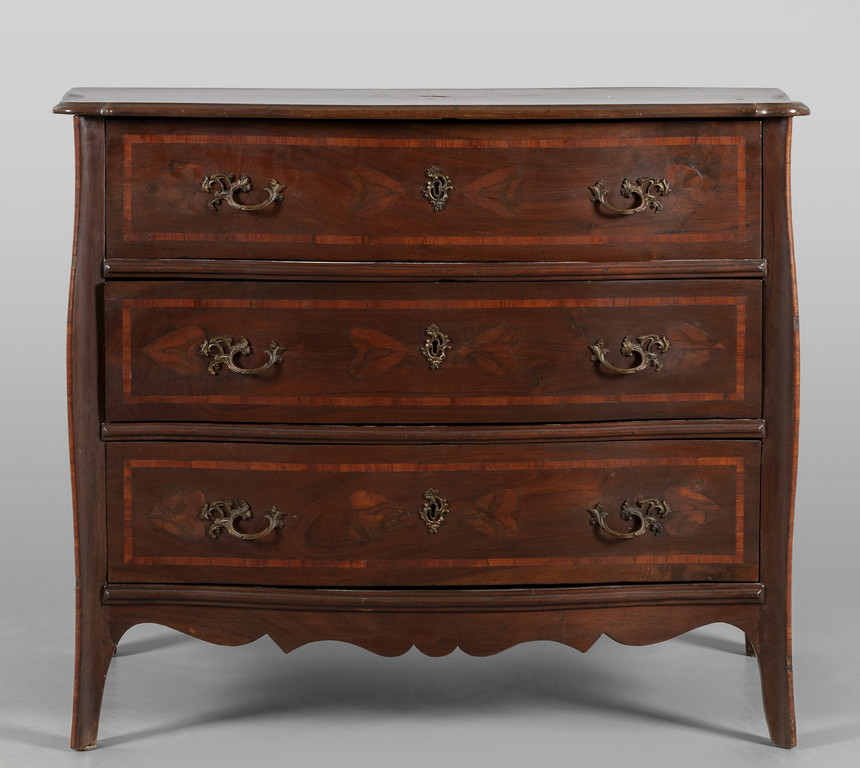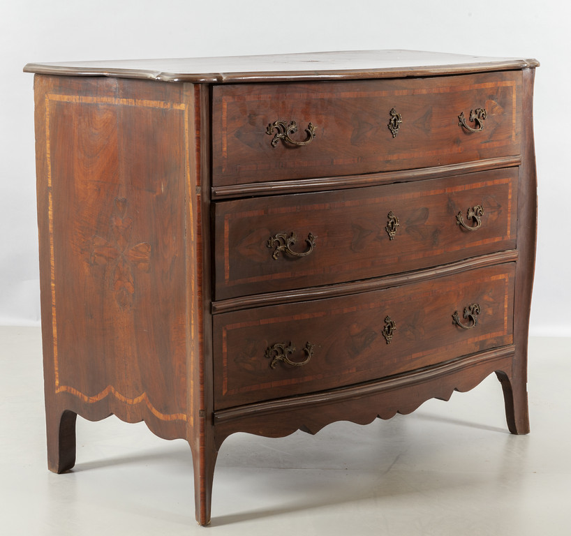 Comò Luigi XIV a tre cassetti intarsiato con il motivo del quadrifoglio piano in legno Genova inizi sec.XVIII