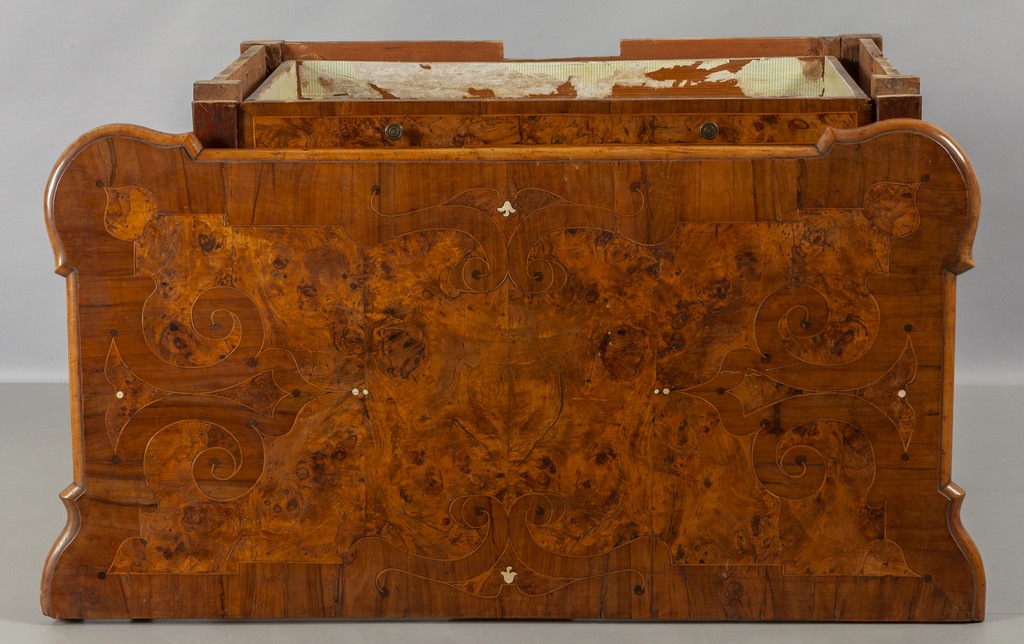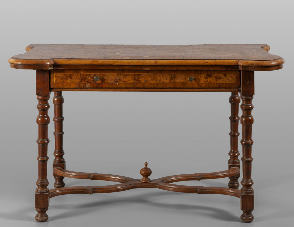 Console Luigi XIV lastronata in noce e radica filettata in ulivo cassetto nella fascia gambe a bottiglia Alto Veneto sec.XVIII