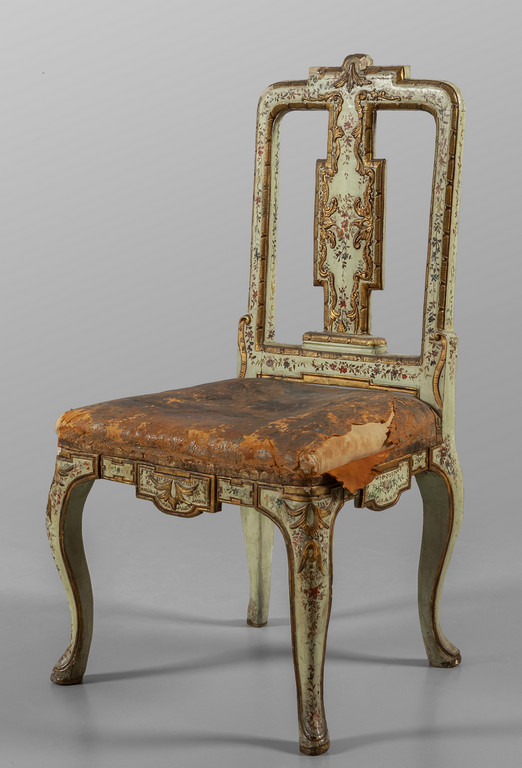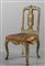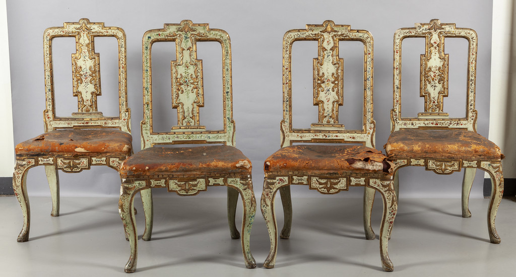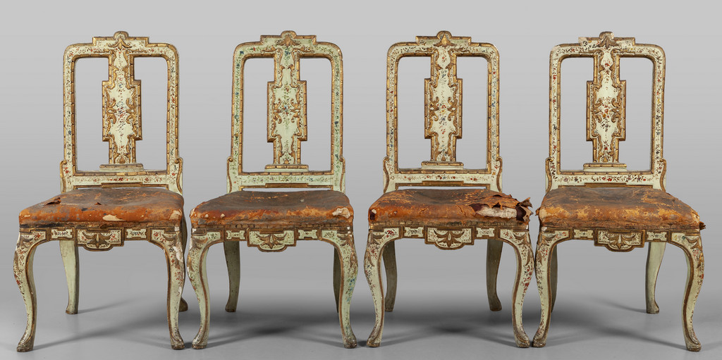 Quattro rare sedie Luigi XIV in legno finemente intagliato dorato e laccato a motivi floreali cuoio inciso di epoca piccole mancanze Sicilia I metà sec.XVIII