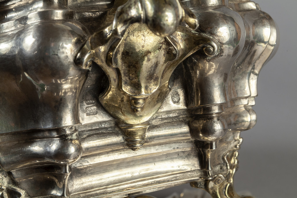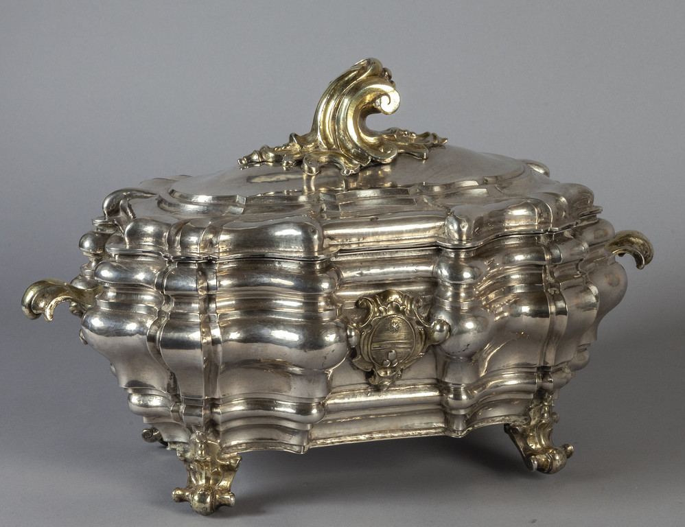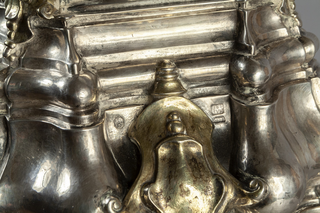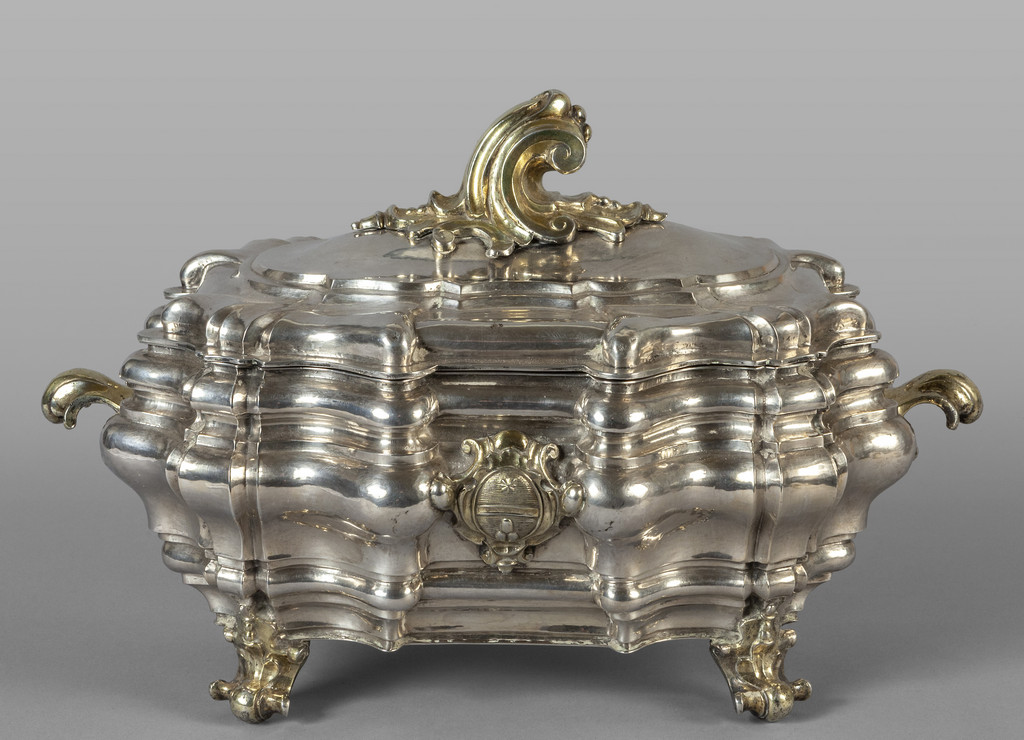 Gennaro de Blasio grande zuppiera barocca in argento e argento vermeille stemma della Famiglia Albani punzone di Napoli d.to 1720 e punzone dell'argentiere