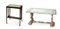 base in legno argentato raccordata da traverse. 52x102x53; il secondo in pioppo verniciato; piano con piastrelle, due piani estraibili; base raccordata da una traversa.73x56x40,5