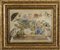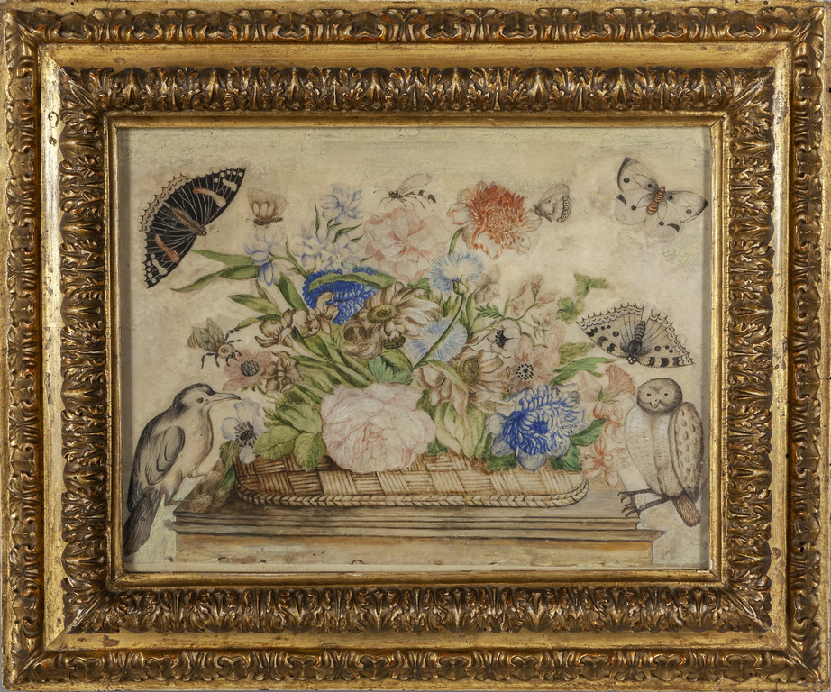 (attribuito) 'Cesto fiorito poggiante su davanzale contornato da uccelli e farfalle' tempera su pergamena eccezionale cornice coeva in legno finemente intagliato e dorato a due ordini