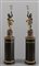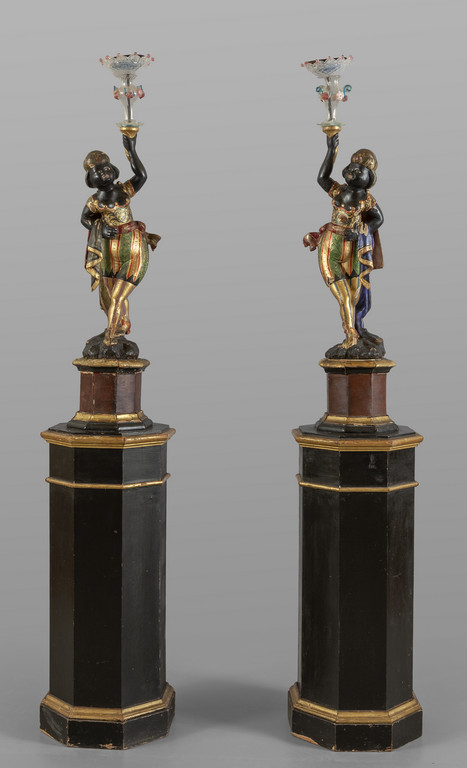 Coppi di moretti portaluce in legno laccato e dorato poggianti su due colonne di forma ottagonale bracci portaluce terminanti con due candelieri in vetro di Murano policromo Venezia sec.XIX