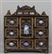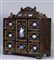 Raro monetiere in legno ebanizzato a sette cassetti e sportello riccamente decorato con smalti colorati ripetuti nella parte superiore Marche sec.XVII