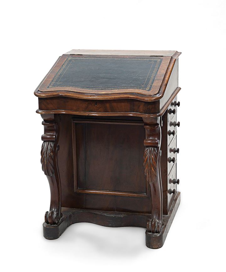 Scrittoio da centro, Inghilterra, metà XIX secolo, in mogano; piano apribile, inclinato con cuoio; la calatoia cela quattro tirettini e cinque vani