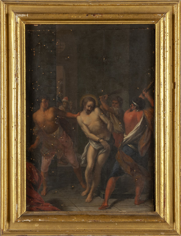 Scuola genovese sec.XVII 'Cristo alla Colonna' olio su tavola cornice coeva in legno intagliato e dorato