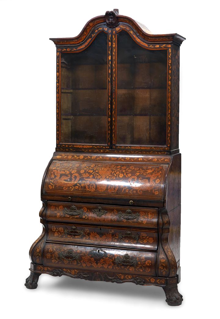 Parte superiore a due ante con vetri; parte inferiore mossa sul fronte; scrittoio a rullo, la calatoia cela nove tiretti e vani; tre cassetti sul fronte; poggiante su zampe leonine