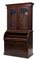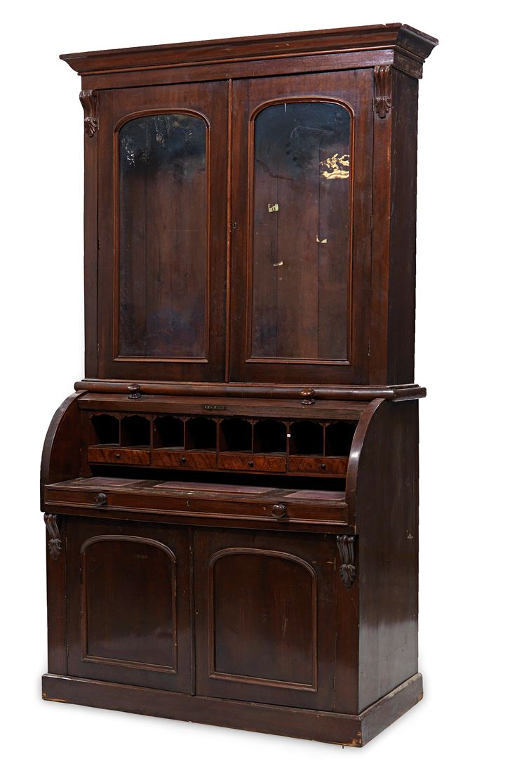 Parte superiore a due ante con vetri; parte inferiore recante calatoia a rullo con scrittoio estraibile che cela leggio; otto tiretti lastronati in radica di mogano, otto vani; sotto lo scrittoio due ante