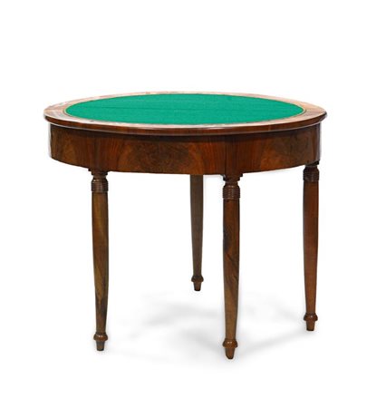 Tavolino da gioco a forma di mezzaluna, Piemonte secondo quarto del XIX secolo, lastronato in piuma di noce; scacchiera sul piano; all'interno panno verde.