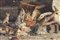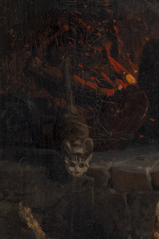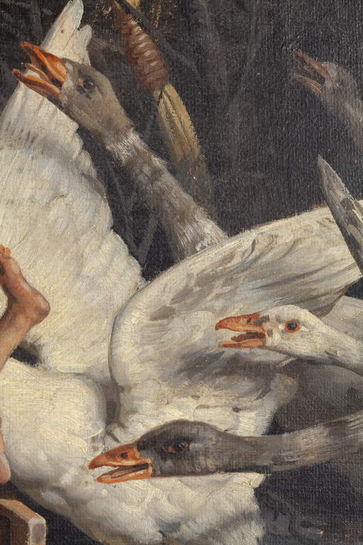 Si tratta di una delle tante redazioni di questo suggestivo soggetto replicato e arricchito in varie interpretazioni e misure. Nella mirabile versione qui analizzata lo spavento e scompiglio creati dall'irruzione del branco di oche causa un 'patatrach'; la bambina assalita cade dalla seggiola ribaltata tra piatti rotti e vasellame infranto nel'antica cucina accanto al camino acceso mentre gatti e pulcini frequenatori abituali dell'ambiente con circospezione approfittano dell'occasione. Nello sviluppare questo fortunatissimo soggetto Chierici esprime in questo suo periodo migliore con pienezza di valori pittorici le alte qualità di artista nell'impianto costruttivo saldo ed equilibrato nella meticolosa cura del dettaglio raffinato nei toni e nei particolari: dal pavimento irregolare ma esatto nelle sue scansioni agli oggetti sparsi agli animaletti di casa interpretati con vivezza; è tutto un mondo che sta a cuore all'Artista e che egli vive con sentimento profondo ed affetto.