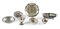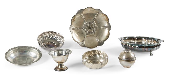Lotto composto da sette oggetti in argento: quattro alzate di forme e dimensioni diverse, di cui una con piedini; un centrotavola a forma di fiore decorato a motivo di fiori e spighe