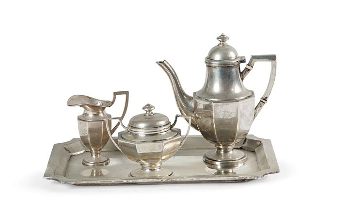 Servizio in argento "egoiste", composto da: una lattiera, una caffettiera, una zuccheriera e un vassoio