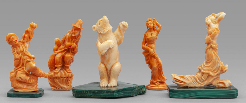 Lotto di cinque statuine in corallo di cui tre montate su base in malachite inizi sec.XX